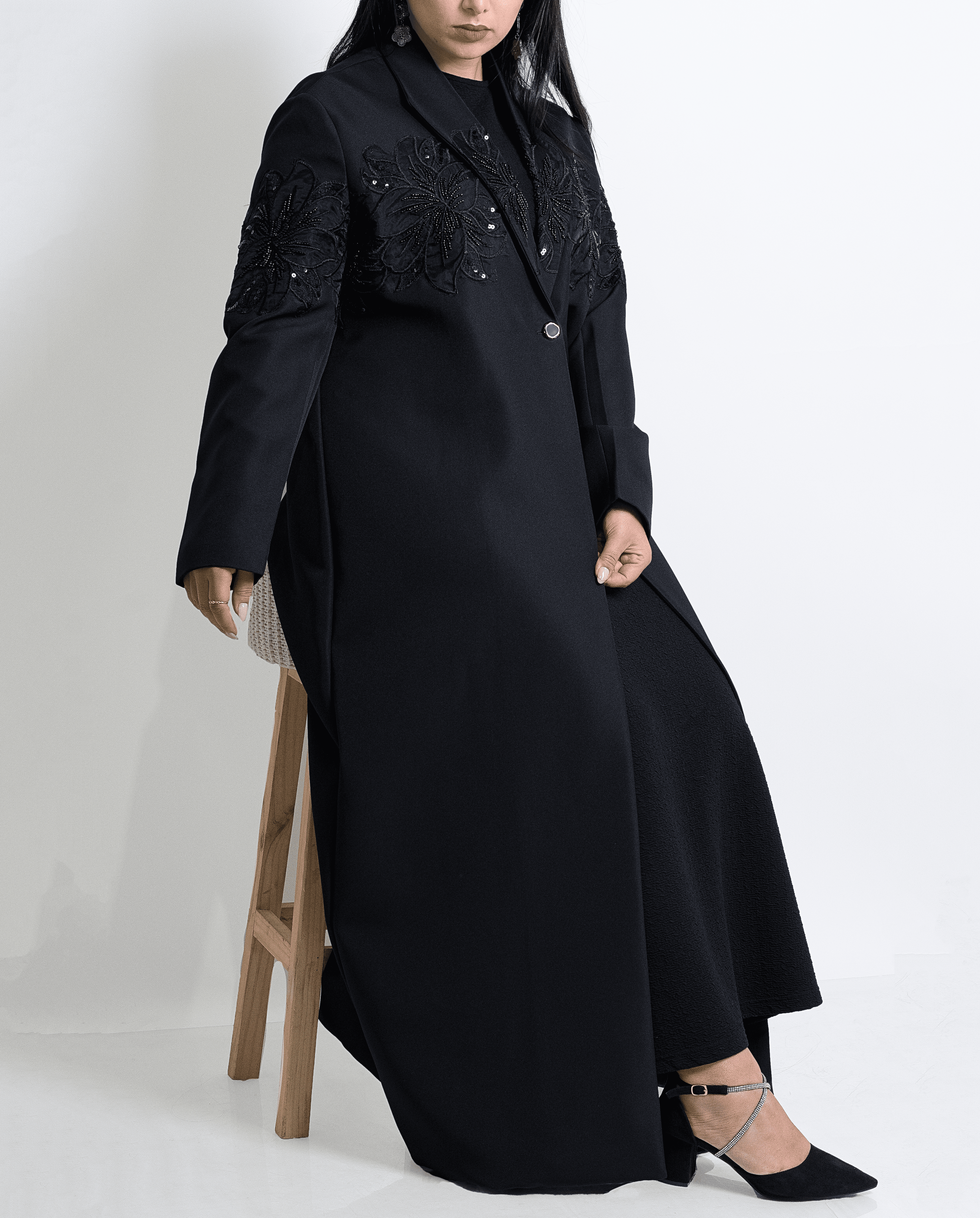 والعباية مستوحاة من تصميم البليزر الرسمي، مع ياقة أنيقة وأزرار أمامية تضيف إليها طابعًا مميزًا، كما تم تعزيز التصميم بتفاصيل جذابة مثل الورود الناعمة التي تزيد من جمال العباية وأناقتها.